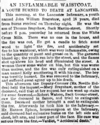 This morning, at the Lancaster Infirmary, a youth named John William Brayshaw, aged 14 years, died from burns received on Thursday night. He was the son of Thomas Brayshaw, Back Marton Street.